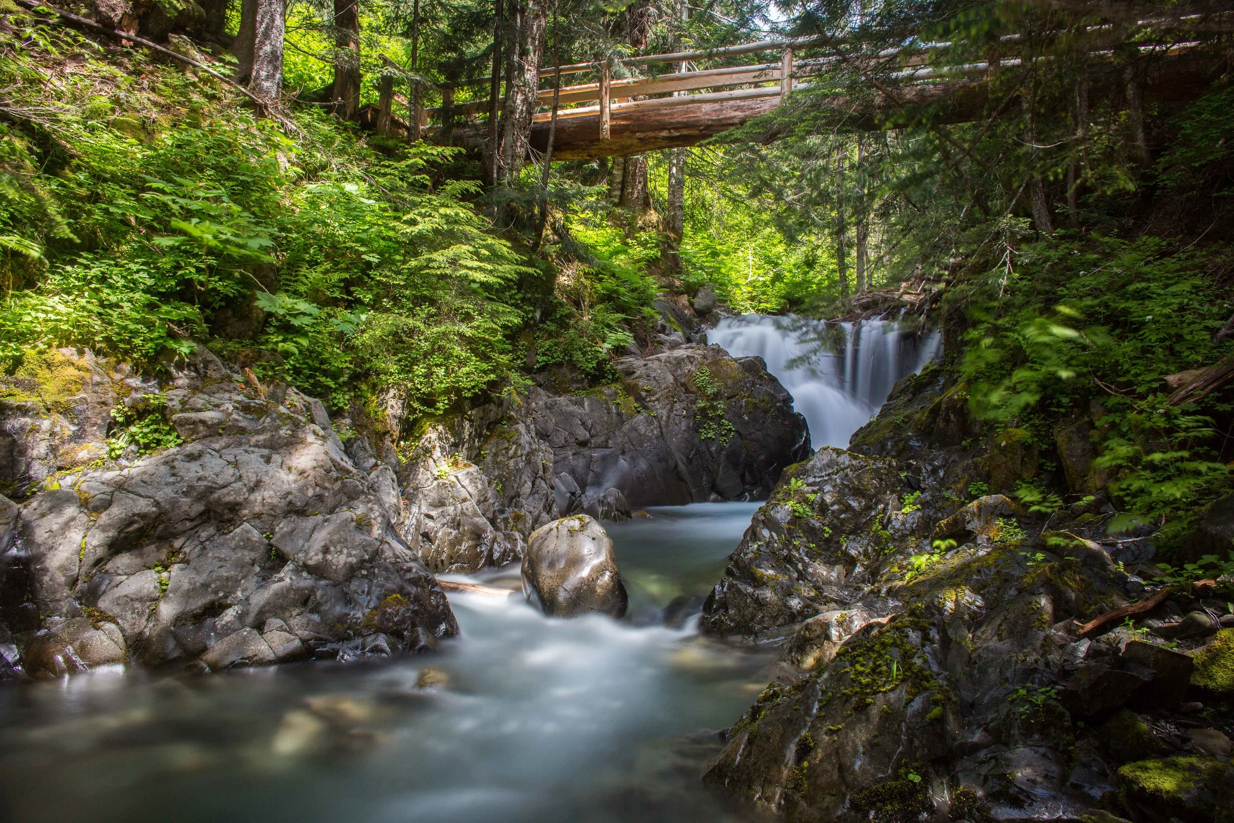 We met up at the trailhead on Friday night and slept there in order to hit the trail bright and early. The hike begins at the Sol Duc trailhead, tucked away in a beautiful old-growth forest at the Northwestern end of the park. There is a large campground and hot springs resort just before the trailhead. At around .7 miles or so (and along with hordes of people), you come to Sol Duc Falls, a picturesque waterfall. Here the trail splits, and from this point you can decide whether to do the High Divide Traill in a clockwise or counter-clockwise loop. Our camp itinerary put us in a counter-clockwise direction. Taking the split off towards Heart Lake, the crowds vanished, and we hiked along a relatively flat trail past the numerous Sol Duc campsites. Here, the forest was quite thick and lush, and with the rising sun, the air became very thick and humid.