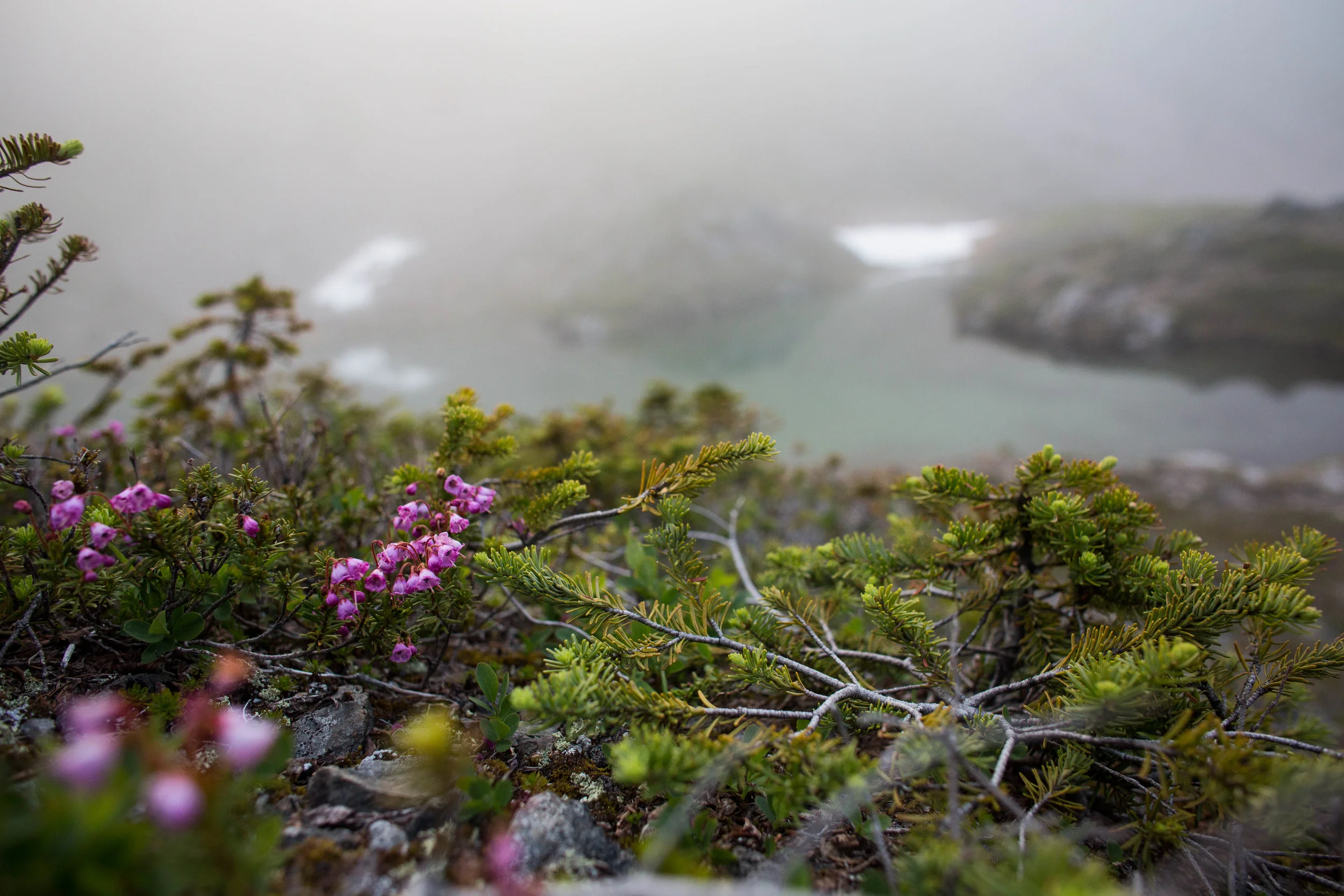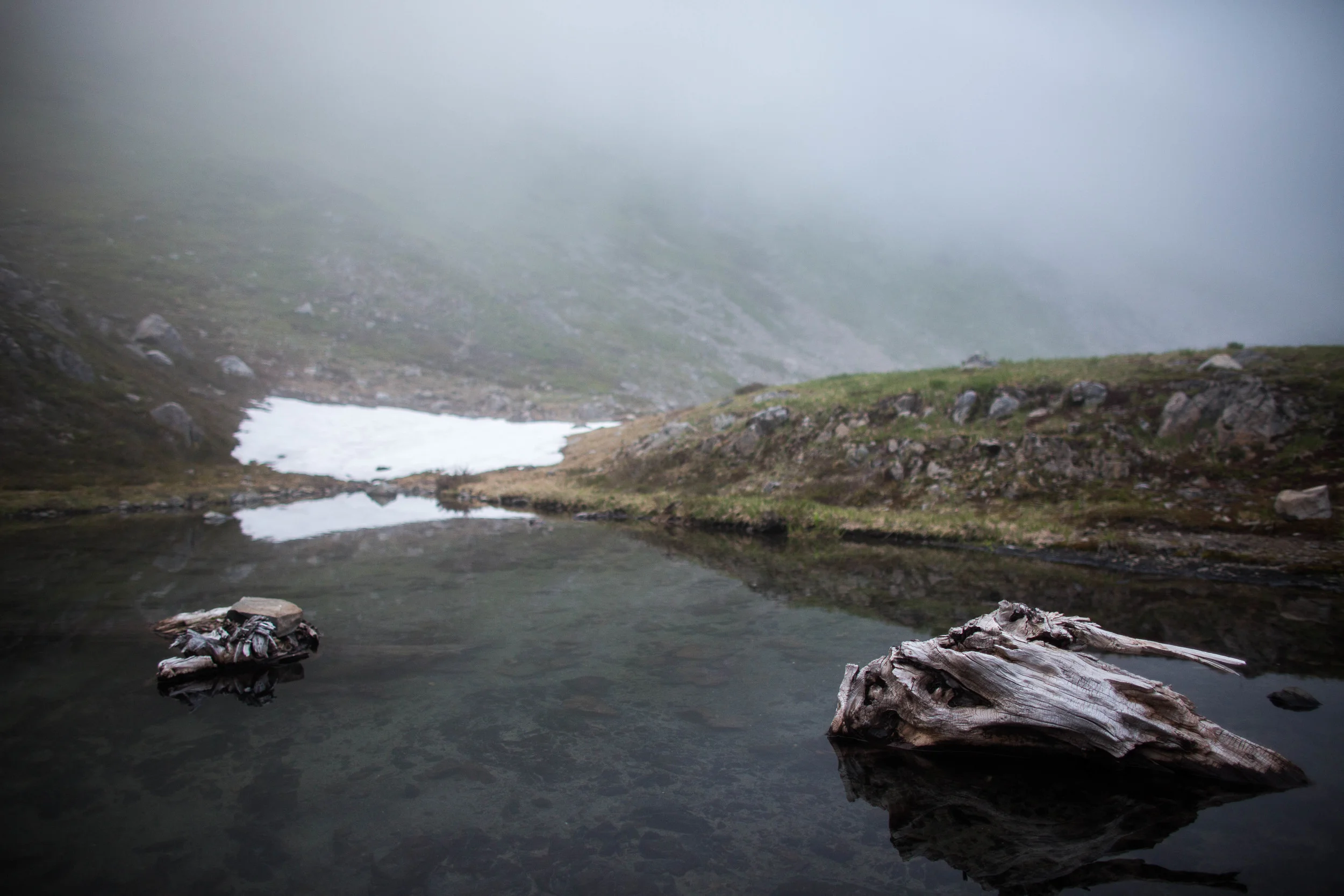 The trail began to steeply climb, and eventually began to cut across the upper slopes of Cat Basin. The meadow I was in was hundreds of feet below us. This seemed like the right trail. After much arduous climbing, we finally ascended over a rise and saw the most beautiful blue-green lake. The infamous Swimming Bear Lake. And it was perfect. After around 10 or 11 miles (including all our random bushwacking and trail finding) we found our home for the night. At this point, the fog kept rolling in and out of this part of the basin. We occasionally got some views of the mountains to the south, but for the most part, everything was covered in fog. Around golden hour, the fog really socked is in. It created a very eerie aura, and i still took the opportunity to take some photos. Bummed I wasn't able to capture the entire scenery, I retired to my tent. However, just before it got dark, the mountains came out for one last visit.