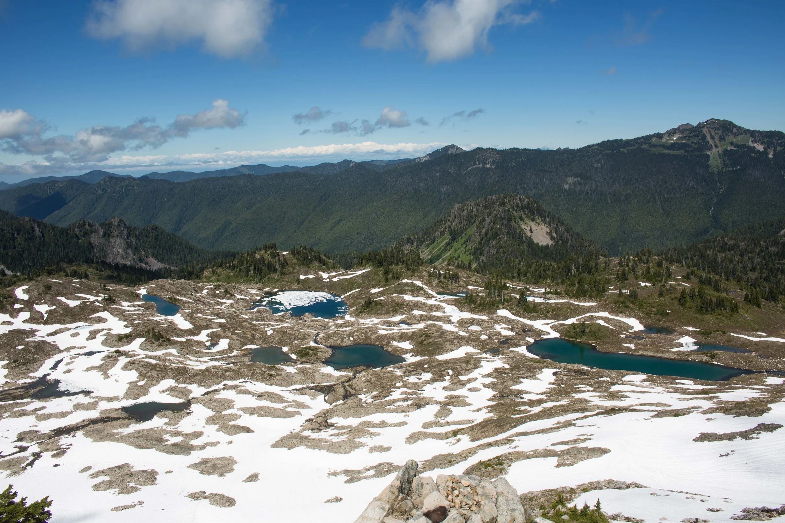 From here, the trail begins to descend. We went through steep switchbacks and descended all the way to the potholes campsite (attractive name i know). The potholes are named for these small ponds that are scattered above Deer Lake. It was pretty swampy, and thus buggy there. We dealt with the mosquitoes as we set up camp, cooked dinner, and rested our sore feet, pummeled by the descent.