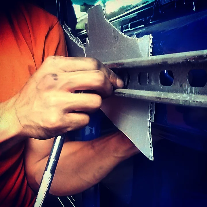 The first steps we took in the van was taking all the old old stuff out of it, and strip it down to it's bare frame. In it's former life, the van was a fleet vehicle for a Philadelphia company called Kint Beverage Concepts, who I believe installs CO2 systems for bars, fountain machines, etc. Unfaded outlines of letters still exist in the paint of the van, and one can make out the website, email, and phone number if seen in the right light.