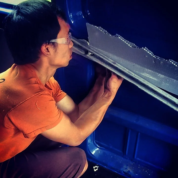 Bulkhead divider was held in place by several large rivets. The rivets had to be drilled out one-by-one. To do this, you first use a drill bit slightly bigger than the rivet head to drill out the center. After that, I used hammer-punch to knock out the rivets. This process took a while, especially since the rivets were steel and the ones securing the floor were very hard to access without contorting my body behind the seats. But after a couple of sweaty hours of drilling, the cab was freed!